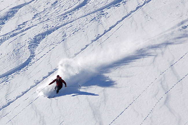Having slid out most of West Monitor north facing yesterday and knowing safe sking could be found, we headed there, finding another group, seemingly intent on cornice removal, in fact, what was left of the New Year cornice.