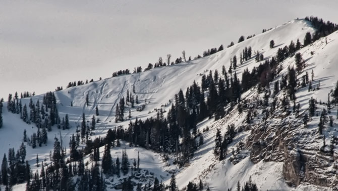 A zoomed view of the slides in Silver Fork, west bowl. The most north facing, sheltered and shady, has released several small slides on, what appears to be, faceted snow layering.