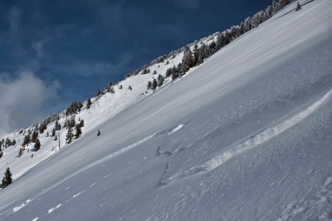The crown was 2-8" deep, deepest on the looker's right flank, next to the treed sub ridge.
