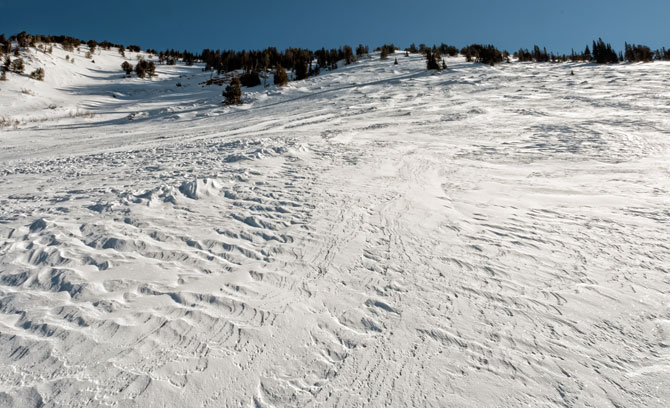 Wind from the last few days had scoured the face with crossloaded shallow drifts and scouring, widespread.